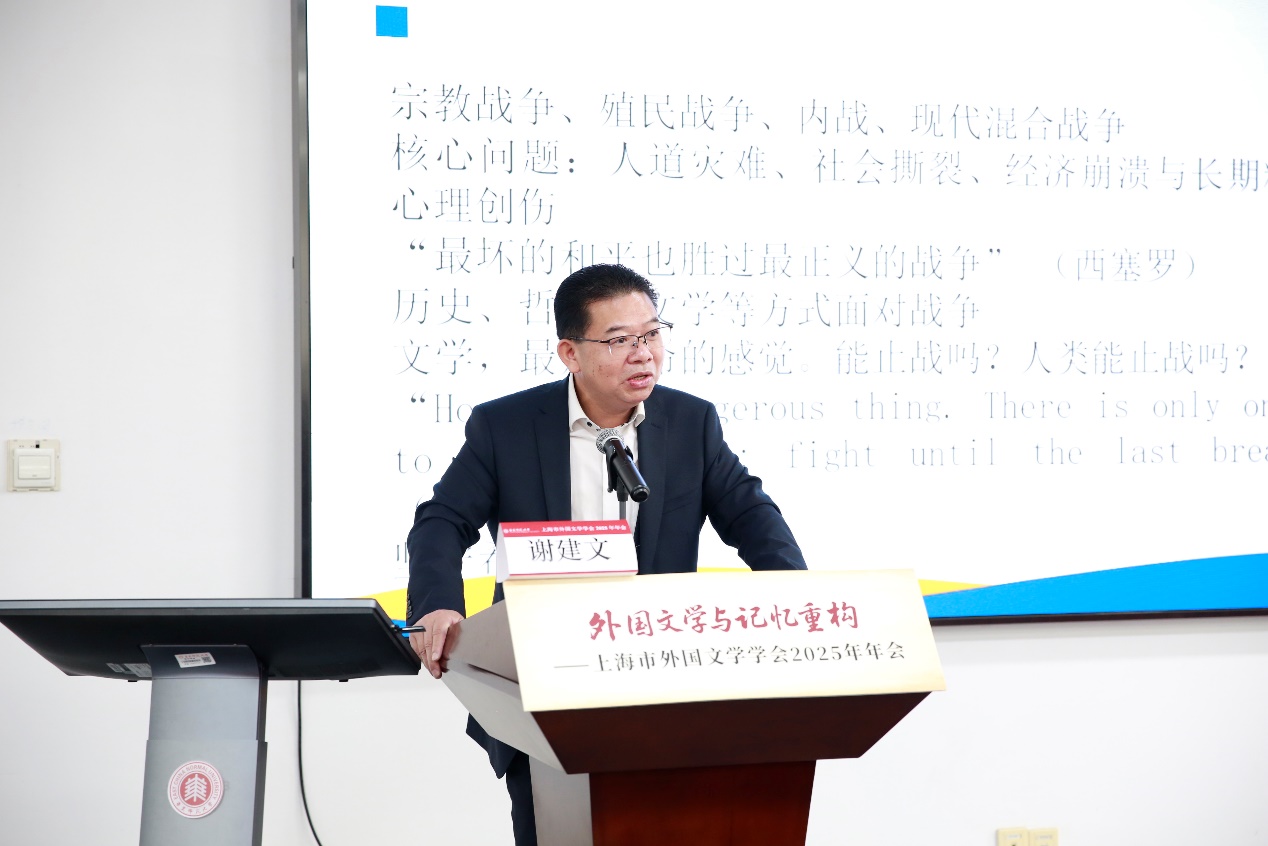 第一阶段的主旨报告由副会长、上海师范大学张静教授和拷贝漫画 胡学星教授主持。副会长、上海外国语大学谢建文教授以《另一个记忆的切口——马塞尔·拜尔<狐蝠>探析》为题,剖析了战争、记忆、声音与文学虚构之间的多重互动关系。谢建文教授认为,拜尔笔下的声音既是记忆的载体,也是重构历史的媒介,“声音档案”不仅再现了帝国末期德国生活轨迹的众声合唱,更在知识诗学的框架下,借助声学、解剖学等跨学科知识,构建了一个兼具身体性、反思性与象征性的叙事空间,最终在真实与虚构的张力中,展现了第三帝国历史记忆的面貌。