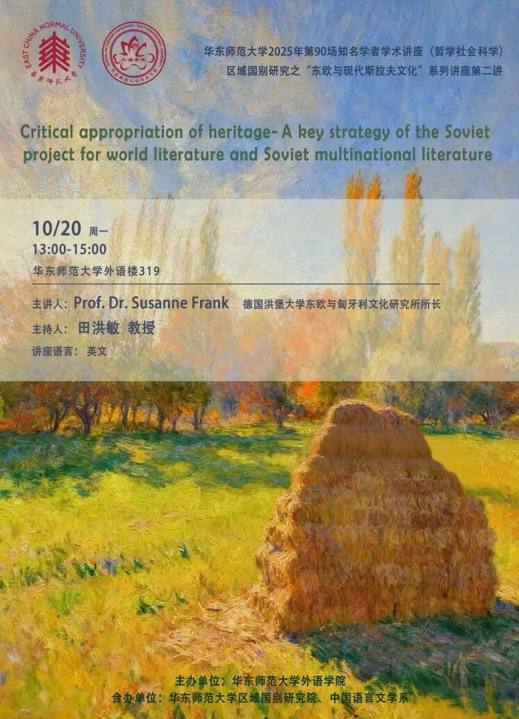 10月20日下午,拷贝漫画 ”2025年第90场知名学者讲座“在拷贝漫画 319会议室举行,主讲人是苏珊·弗兰克教授、博士(Prof. Dr. Susanne Frank),来自德国洪堡大学东欧与匈牙利文化研究所,讲座题目为《批判性地适用文化遗产:苏联多民族文学发展与世界文学概念的界定与策略》,讲座由田洪敏教授主持,来自本校拷贝漫画 、中国语言文学系的老师与青年学子,以及上海师范大学中国语言文学系的博士生、本科生参加了本次的活动,并互动交流。