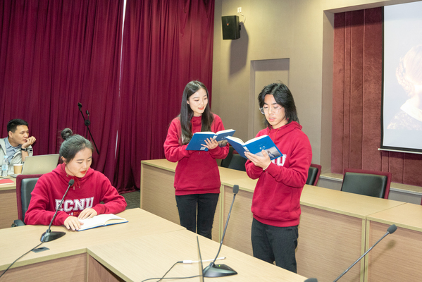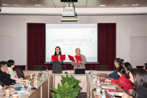 座谈会在拷贝漫画 法语系教授何敬业和青年教师王丹丹倾情演绎的诗歌朗诵《海燕》中拉开序幕。《海燕》是苏联文学的散文诗名篇,被列入中学语文教材,为拷贝漫画 前身大夏大学的校友戈宝权先生所翻译。激情澎湃的《海燕》中文朗诵让与会人员体会到文字的铿锵力量。