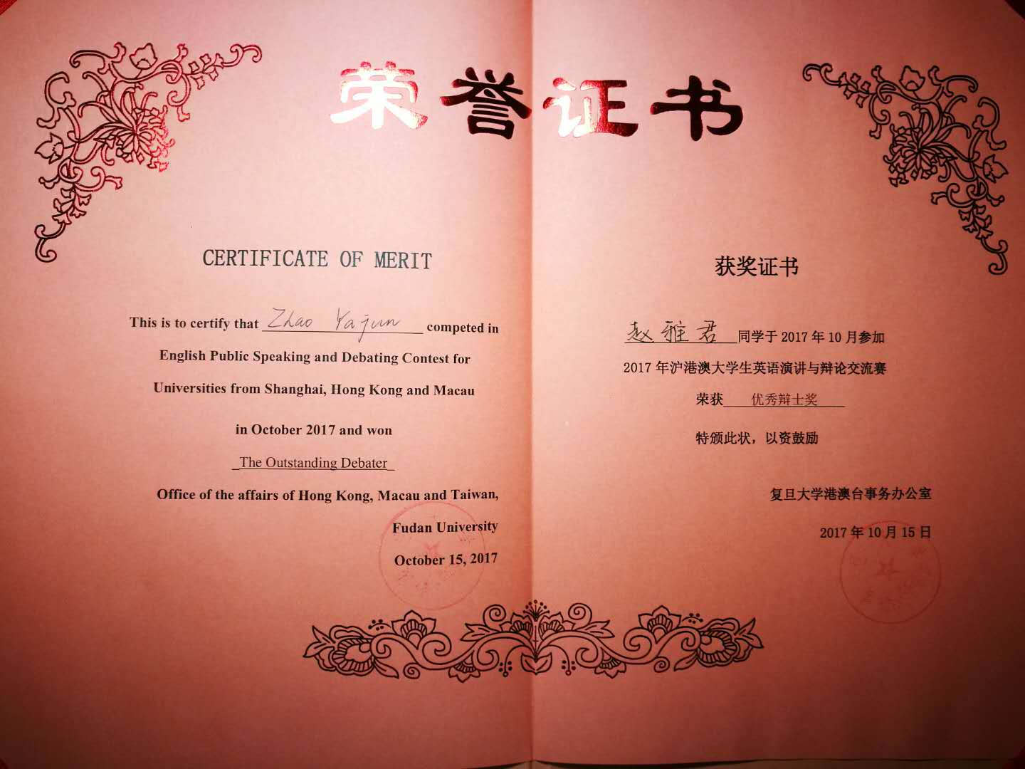 2016级硕士研究生赵雅君于首届沪港澳演讲与辩论交流赛