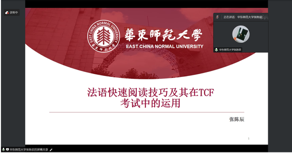 法语系2019级本科生张陈辰介绍了TCF考试的用途、考试题型、时长分布和不同等级的标准,以帮助学习者准备语言考试。针对TCF考试中阅读题量多、阅读量大的特点,她介绍了快速阅读法,并以TCF阅读材料为实例,讲解了如何利用近义词表达、因果关系、重复出现的语句、转折词等定位关键词,并分享了自己考试经验、备考资料和日常练习方法等。