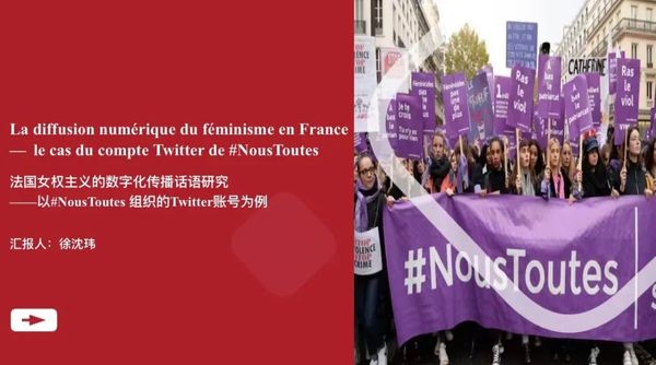 19级徐沈玮同学的论文La diffusion numérique du féminisme en France — le cas du compte Twitter de #NousToutes(《法国女权主义的数字化传播话语研究——以#NousToutes 组织的Twitter账号为例》)选取了法国的反性别暴力女权组织#NousToutes从2018年7月12日至2022年11月13日间发布的2892条推文为研究对象,并基于费尔克拉夫的三维话语模型,从文本维度、话语实践维度、社会实践维度三方面展开了分析,以探求法国女权运动的数字化传播机制和策略,并丰富这一领域的研究视角。