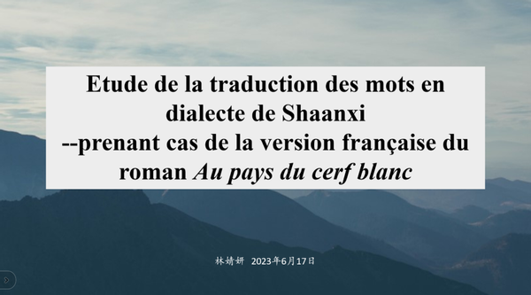 20级林婧妍同学的论文《关中方言词的翻译研究——以〈白鹿原〉法译为例》结合小说《白鹿原》法译本Au pays du cerf blanc中的方言词汇翻译实例进行分析评述,探讨了关中方言词的翻译策略。并尝试在奈达功能对等理论指导下,结合译者的处理方式,提出对其中难以传递方言语言风格的口语化表达的处理意见。最后提出在中华文化“走出去”的时代背景下,针对乡土文学中方言书写的翻译需要倾向异化,最大限度地追求原文语境和写作风格的传递,以期进一步推动中国乡土文化的对外传播。