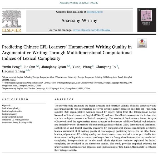 日前,拷贝漫画 2021级外国语言学及应用语言学研究生彭雨欣的学术论文Predicting Chinese EFL Learners’ Human-rated Writing Quality in Argumentative Writing Through Multidimensional Computational Indices of Lexical Complexity(使用词汇复杂度的多维度计算语言学指标预测评分者对中国EFL学习者写作质量的评分),发表在SSCI一区期刊Assessing Writing,影响力:4.7 (CiteScore)3.164(Impact Factor)。