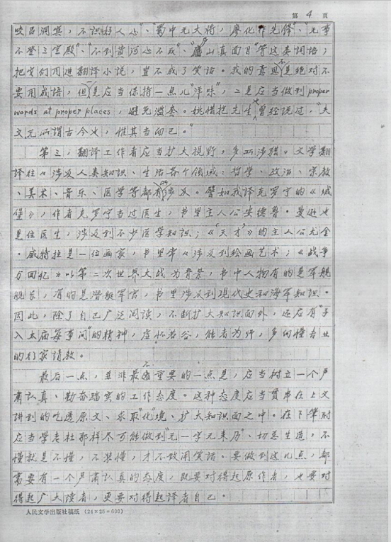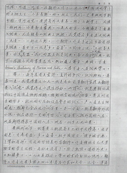 关于如何做好翻译,叶先生也有自己独到的看法:“译者在翻译的时候应当主要根据原文,照顾原文,至于风格则要让它在翻译过程中自然而然地带出来,这个讲法是最妥当的”。先生还提到在翻译过程中,每个字词都要细细推敲斟酌,他说,“哪怕是最普通的词语,辞典总是要去查查……一个大意就会出现差错。那样就对读者不负责任,对自己也不负责任”。先生爱惜羽毛,严谨治学,正是在这样不断的推敲之中达到了炉火纯青的境界。当下,许多青年译者可能只看到翻译大家功成名就,无限风光,殊不知光鲜背后饱含多少艰辛,先生曾戏言,由于翻译工作繁琐复杂,一本书从初稿、校样、再到定稿,常常需要熟读、校改五六遍,因而等到付出心血的译作出版后,自己有时竟然不大愿意再读此书了。