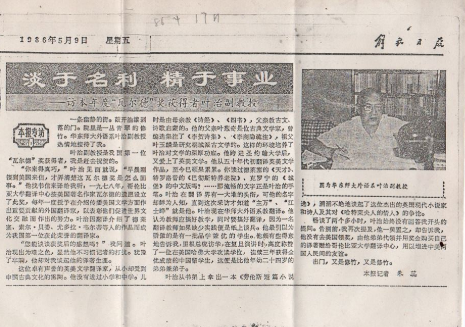 1986年,叶先生因译介美国作家徳莱塞、索尔•贝娄、尤多拉•卫尔蒂等人的作品获得美国哥伦比亚大学翻译中心颁发的桑顿·尼文·怀尔德奖。作为我国获得此奖项的第一人,叶先生并未以此自傲,虽然他无法亲自前去出席颁奖典礼,但却用奖金购买译著回赠给哥伦比亚大学翻译中心,以增进中美友谊和文化交流。