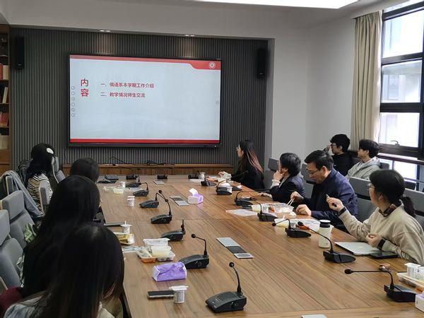 院长王静教授、俄语系系主任胡学星教授及俄语系教师代表、本科生教务秘书吴事国老师、辅导员冯烨老师与来自本系各年级的学生代表们齐聚一堂,共话半个学期以来的学习生活。
