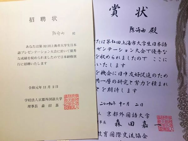 2019年11月2日,由上海教育国际交流协会、日本京都外国语大学共同主办的第32届上海市大学生日语才能演示大赛在东华大学圆满落下帷幕。日语系2016级本科生陈诗雨同学以优异的表现斩获亚军