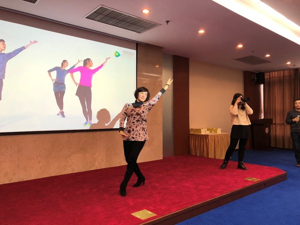 曹辰老师带领大家做京剧韵律操,云手转身、望月指法,一招一式尽显中国传统戏曲文化的韵律之美。
