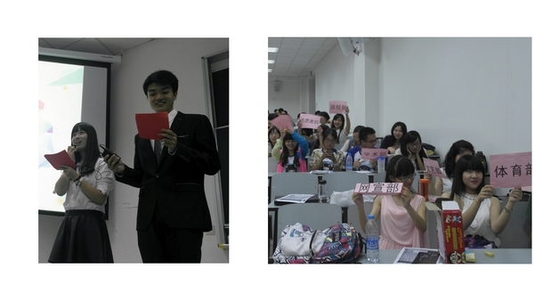 首先是团委副书记的致辞,金康学长以这次招新大会举办前的小小坎坷为例,讲述了举办活动的不易,给各位准干事们上了生动的第一课。在部门介绍环节中,外院团学联十一个部门以各种创意的形式,向新生介绍部门工作,并展现部门风采。如组织部的樱桃小丸子配音表演,体育部的卖萌耍帅组合,和思辨部高贵冷艳的部长艺术照等等。外院的谜纪推理社、七草动漫社、和风社、法语俱乐部等五个社团、六个本科生工作室,以及外院学生领导力中心,也各自拿出看家本领,展示丰富多彩的活动,期待着新生们的加入。最后,学生会主席邱雅莹学姐,用热切的言语,为新生们未来在外院的成长与进步,许下美好的祝愿。最后,各位新生纷纷将手中的干事申请书,郑重地交到各位部长手中。至此,拷贝漫画