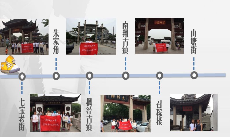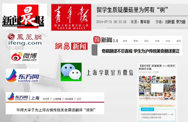 从2014年6月底开始,“美食翻译”项目组分别去往了七宝、朱家角、山塘街、南翔、召稼楼以及枫泾六个著名的上海周边古镇,进行古镇店家的采访,以及英文菜单的收集。8月份开始,项目组同学开始马不停蹄地制作成果,制作了古镇的美食地图,对江南古镇特色菜进行了翻译并制作出菜单样本赠送给店家,还通过回顾和反思撰写出精彩的调研报告。9月26日,项目组顺利通过知行杯终期答辩。调研过程中,项目得到了许多媒体的关注,包括青年报、凤凰网、东方网、网易新闻和新闻晨报都对我们的实践活动进行了报道。