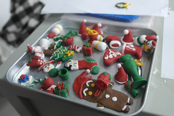 在活动现场,每位参与的同学都得到了不同颜色的软陶,照着模型开始动手制作自己的圣诞软陶小饰品。同学们的参与热情十分高涨,现场活动气氛浓烈。除了有圣诞帽,小雪人,小苹果等等常见的圣诞装饰品,同学们还发挥创意,制作了可爱的动漫角色“无脸男”等挂件......同学们的想象力和动手能力都得到了很好的发挥。本次活动不仅吸引了众多外院同学,更有外国留学生的参与。活动最终取得了圆满的成功,不少同学表示希望今后能有更多这样的精彩活动来丰富同学们的课余生活。