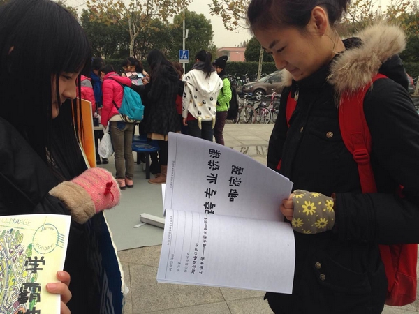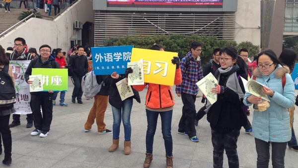 ”、“学霸”、“蹭课”、“学在师大”等字样的宣传板,站在路旁进行宣传,不时有同学停下脚步饶有兴趣地对“学霸地图”进行问询,干事们热情为其讲解,并告知其电子版下载地址。寒风凄凄,冷气砭骨,但干事们热情不减,喊着“学霸地图在手,华师课程我有”,高举海报与宣传板,并对此次活动进行照片留影。过往同学纷纷驻足,询问活动和地图相关事宜,活动办得热火朝天,寒冷似乎也不足为惧。
