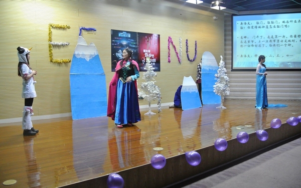 这是一个改编自2013年度最热电影的话剧。西班牙语系的同学仿佛将一个个经典的电影镜头逼真地呈现在了观众的眼前。华美绚丽的服装,动人心弦的歌唱,惟妙惟肖的场景仿佛再次把我们带入一个奇幻的冰雪世界,安娜和姐姐爱莎之间血浓于水的亲情化解了危机,同时也深深感染了在场的每一位观众。