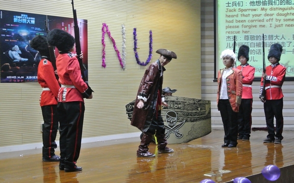 本次舞台剧大赛上阵容最大,气势最强的翻译系剧组为我们带来了加勒比海盗的第一部曲。“黑珍珠”号海盗船的船长杰克和威尔通过与海盗的智勇斗争救回了总督的女儿伊莉莎白。男主角将杰克船长的神韵出神入化的演绎了出来,令观众随着剧情的展开而被深深地吸引,如同身临其境。翻译系全班同学用他们的智慧和汗水为我们呈现了一部精美的话剧,他们团结合作的精神也令人深深地敬佩。