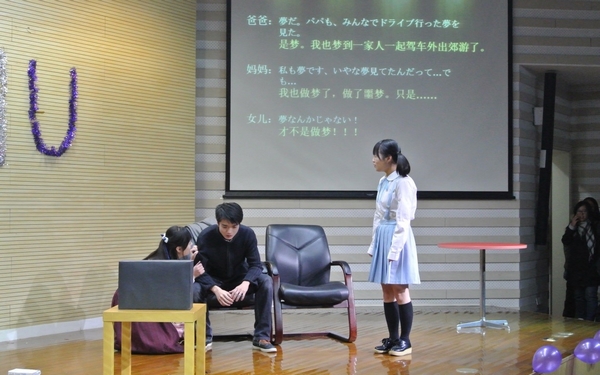 灯光亮起,首先映入大家眼帘的是一幕医生急救三口之家的画面。紧张的气氛和令人窒息的声音吸引了在场所有的观众。寂静的夜晚,黑暗带来了灾难,剩下时间只有三天,而一家三口中必须有一人选择死亡。夫妻二人为了对方活下来采取无奈之举。然而,谁能料到,最终,却是幼小懂事的女儿主动选择了死亡。日语系同学将每个情节演绎的淋漓尽致,引得场内观众阵阵热烈掌声,在场的每个人也为亲人之间无私的爱而感动落泪。日语系获得此奖可谓当之无愧!