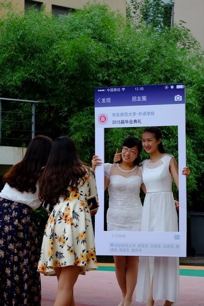 2015届毕业生朋友圈”,用泡沫板模仿热门社交平台制作了一个创意道具。毕业生们纷纷利用这块泡沫板进行合影,为他们的毕业日添上浓墨重彩的一笔。