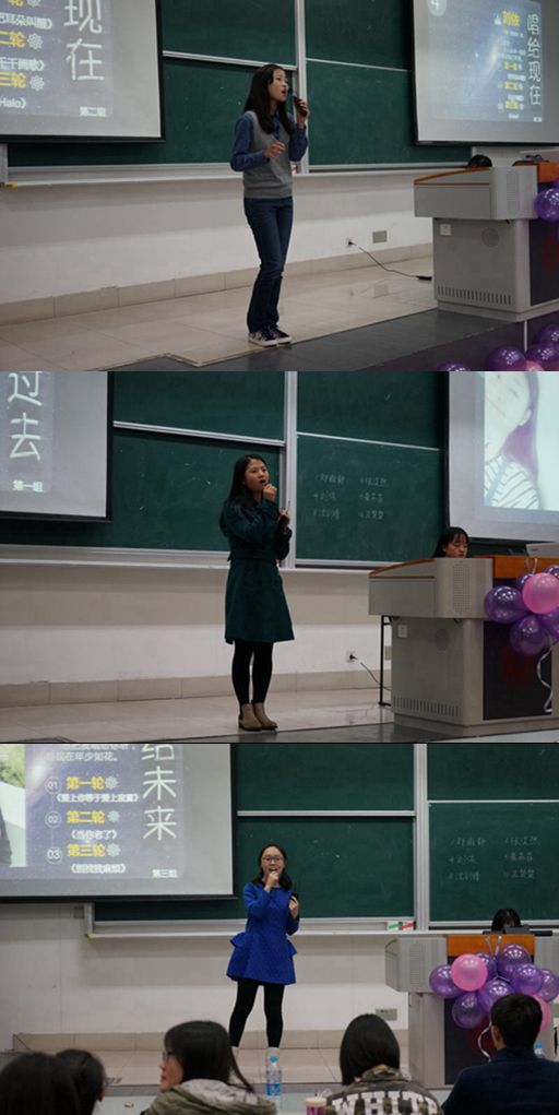 开赛前,由文艺部同学带来的舞蹈串烧点燃观众激情,带动全场氛围。第一轮比赛中,郑雅静同学以一首《映山红》霸气开场,随后选手们带来《没那么简单》《When You Are Gone》等经典曲目,小清新汪书琳同学自备道具,生动表现了《中二少女养花记》;第二轮比赛中,选手再度发力,实力唱将沈剑锋以一曲《E.T.》展现个人实力,黄苏菲同学带来日文歌曲《水彩の月》,情感细腻,收放自如;比赛进入最后一轮,《If I Die Young》《Halo》两首歌曲将比赛氛围推到顶点,选手顶住压力,表现堪称完美,整场比赛精彩纷呈。