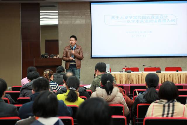 大学英语教学部的周小勇副教授以《基于大夏学堂的翻转课堂设计》为题,以学术英语课程为例,介绍了自己利用大夏学堂平台开展教学工作的实践经验。