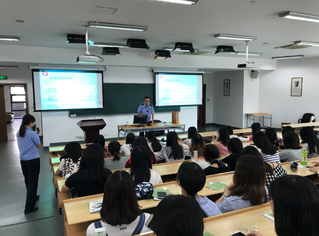 邀请高校派出所的王警官和李警官在外语楼333开展了大学校园安全专题教育。王警官向新生讲解了诸如防火、防盗、防骗、交通安全等八个方面的问题。通过列举高校真实案例、播放典型案例视频等方式,他指出了大学生防盗意识淡薄,容易轻信他人,导致钱财损失,人身安全遭到威胁的现状。同时,他还向新生们简单介绍了窃贼偷盗的惯用伎俩,希望新生们注意宿舍防盗,时刻保持警惕,不给盗贼留下可乘之机。警官还用一些公益广告、幽默的小视频介绍了当今社会繁杂多样的诈骗手段,大家在惊讶的同时也深深的认识到拥有电信安全意识和知识是多么的重要。在分享提问环节,同学们也说出了自己经历的一些骗局,例如短信电话诈骗、微博中奖,冒充QQ好友,淘宝刷单,警官都一一给予回应。在讲座的最后,警官提出:希望新生们能够用实际行动,真正做到遵纪守法,成为一名文明、健康、有为、诚信的大学生。