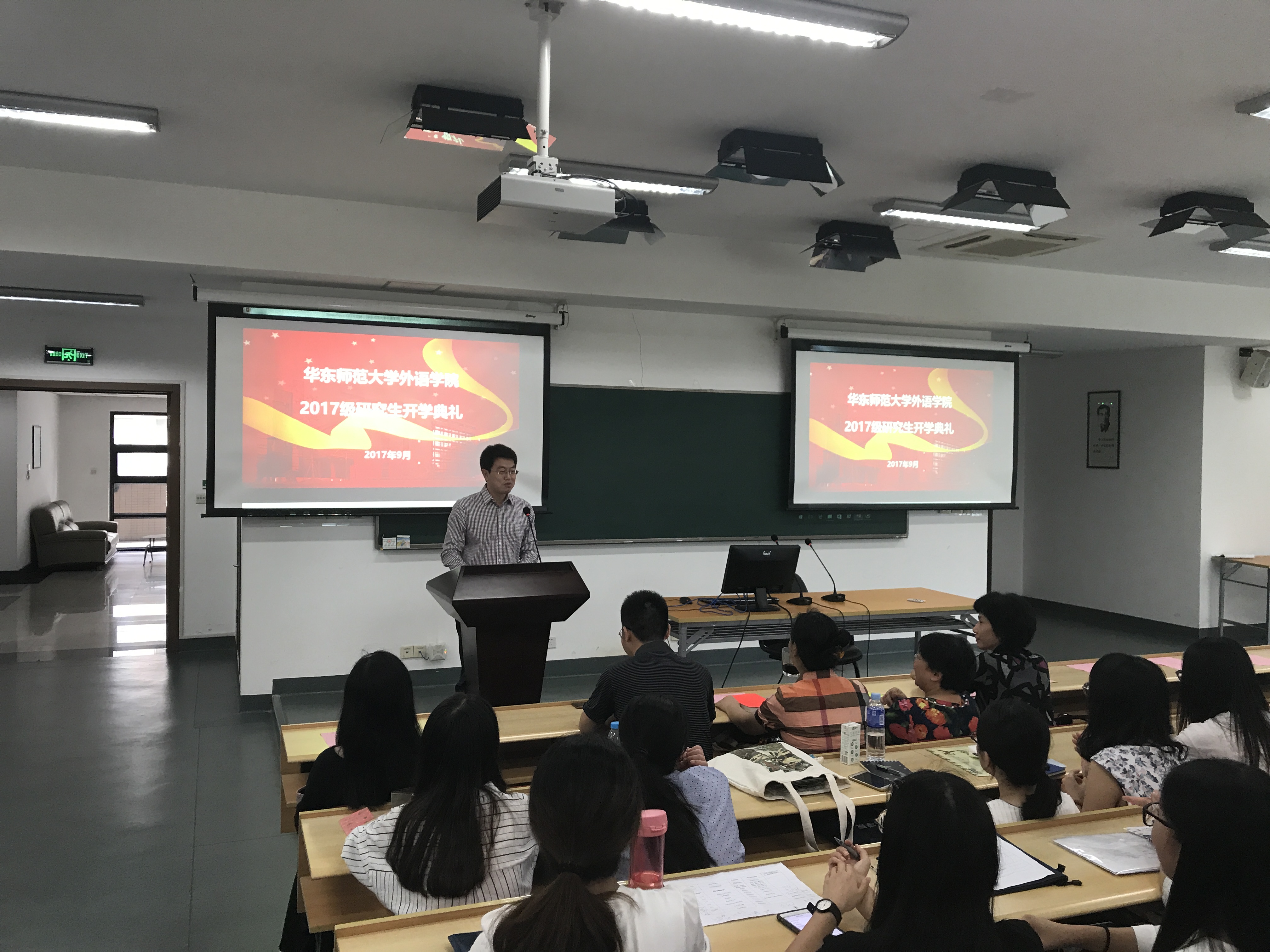 在333会议室举行2017级研究生开学典礼。院长袁筱一老师,院党委书记俞黎阳老师,副院长朱晓映老师,副院长侯敏跃老师,英语翻译教工党支部书记全建强老师,日语系系主任尹松老师,法语系系主任王静老师,俄语系系主任朱晓映老师,德语系教师尤岚岚老师,研究生辅导员们以及2017级所有研究生新生到场参加。会议由副院长杨延宁老师主持。