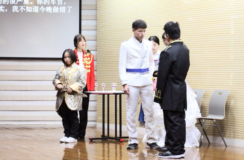 英语师范的《奥赛罗》首先登场,拉开了大赛序幕。同学们挑战莎翁经典悲剧《奥赛罗》,用短短的二十分钟,完美地演绎了爱情与嫉妒,轻信与背信的深刻主题。男主角一身白色戎装,生动地刻画出奥赛罗“复杂矛盾体”的形象,女主角长裙曳地,也充分展现了狄蒙娜高贵善良的品质。他们华丽精致的服装和妆容,生动形象的演技赢得了评委老师和观众的阵阵掌声。