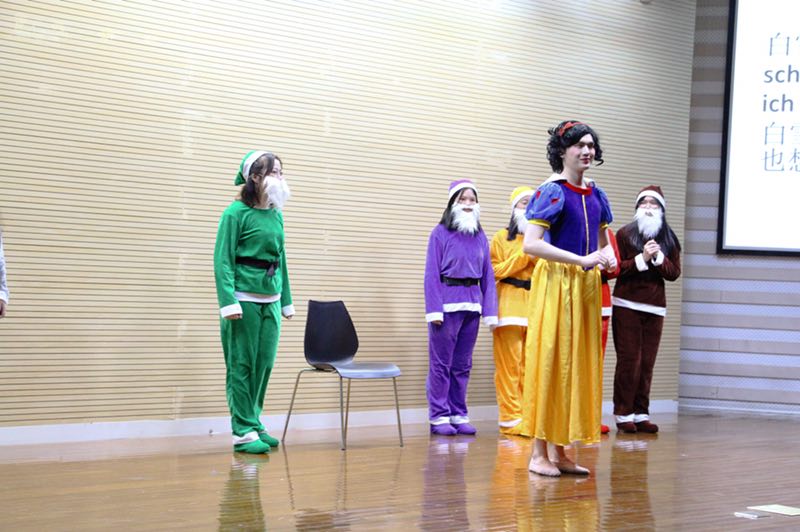 作为舞台剧大赛的银奖获得者,德语系的《白雪公主》用大量的反串设计承包了此次大赛的诸多笑点,大大活跃了现场氛围。其中由德语系唯一的男生谢盈峙反串的白雪公主无疑是该剧最大的亮点之一,他毫不忸怩,全情投入,让人忍俊不禁的同时又心生敬意。此外,秦雪瑶同学演绎的王后也给人留下了深刻印象,并以此获得了最佳女配角奖。