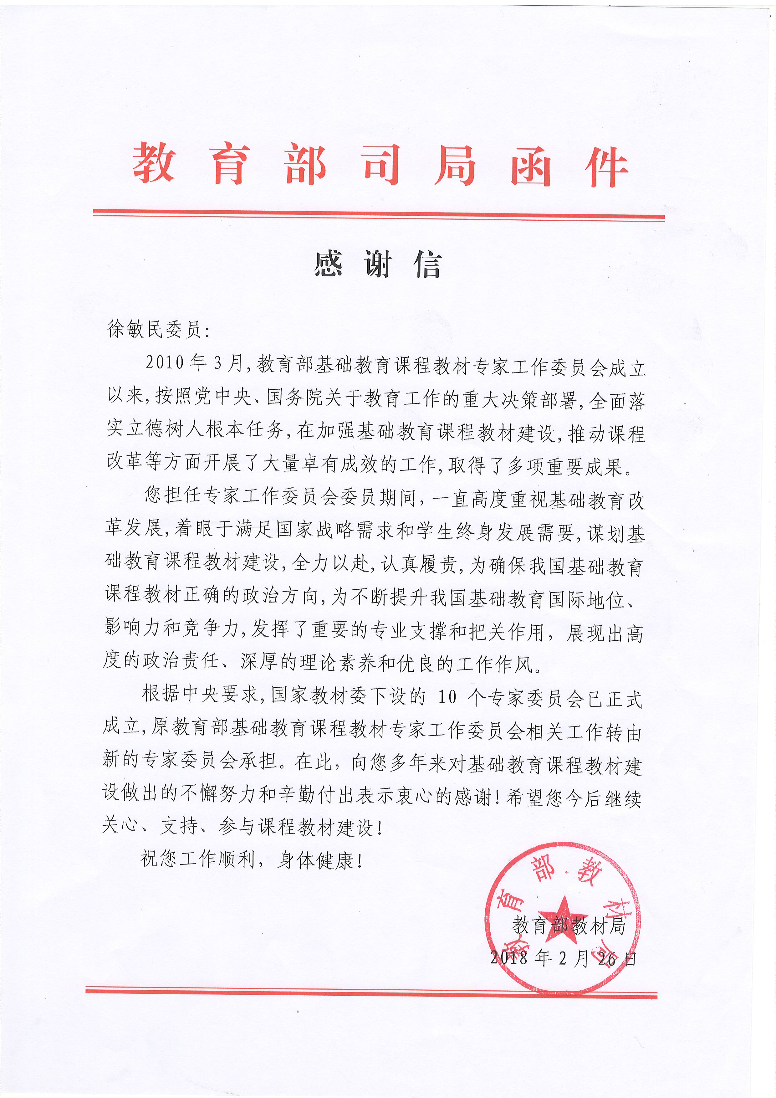 徐敏民教授还参加了教育部普通高中课程方案和学科课程标准修订工作。教育部教材司在感谢信中提到:“您作为普通高中课程修订组的一员,在修订工作中始终保持积极的工作态度、饱满的工作热情、以高度的责任感和使命感圆满的完成了修订任务,表现出较高的政治素质和专业水平,在明确高中教育定位、优化课程结构、凝练学科核心素养、研制学业质量标准、进行核心素养可行性测试等方面进行深入研究论证,取得了重要成果,为构建具有中国特色、国际视野的普通高等课程体系做出了积极的贡献”。