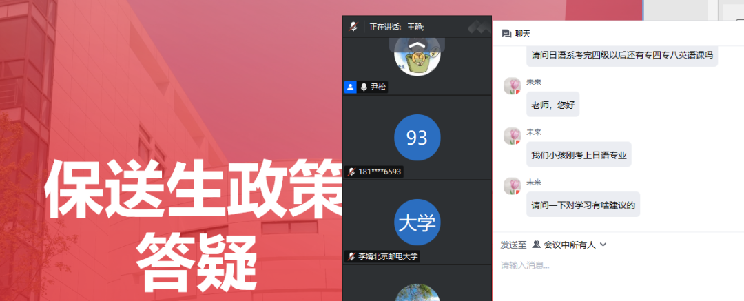 副院长王静教授和尹松教授详细解答了外语类保送生及家长们关于培养方案、日语学习、校际交换等方面的问题。两位老师鼓励同学们积极参与创新项目及国内外交流,全面提高个人素养和就业竞争力。