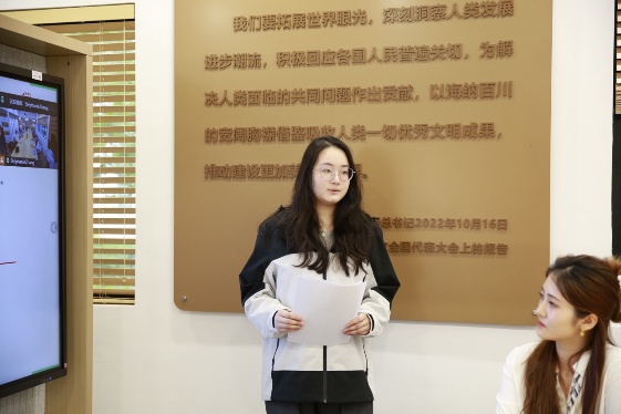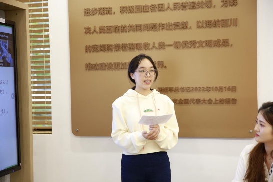 支部党员们结合自身专业特色,聚焦于翻译在推进中国特色现代化进程中的核心作用,围绕“如何通过翻译推进中国式现代化的实现”主题展开了讨论。孟芙羽认为,针对当前翻译面临文化差异、术语差异、翻译质量低等多重挑战,翻译人才培养应兼顾跨学科知识和国际视野,既要理解外来文化,也要传播好中国文化,这种双向性于文化传播而言至关重要。姚欣宇认为,在充分借助AI技术提升翻译效率的同时,也要坚守人文底色,在“译什么”“如何译”中传递真实、立体的中国。