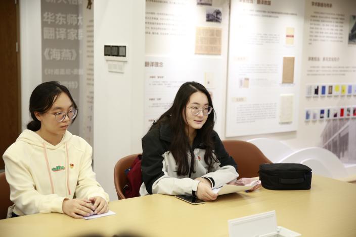 在讲解员的带领下,党员们参观了丽娃河畔的翻译家成果展和手稿展,深入了解了自20世纪以来,丽娃河畔的翻译家们的卓越成就。党员们驻足于王智量、王冀刚、何敬业、徐振亚、曹国维等翻译名家的手稿展柜前,泛黄的纸页上密密麻麻的批注与修订痕迹,无声诉说着翻译家们“一名之立,旬月踟蹰”的严谨治学态度。展览中,《老人与海》《海燕》《莎士比亚全集》《浮士德》等经典译作尤为引人注目,仿佛是一场聚焦文学经典的跨时空对话。大夏大学校友郭大力翻译《资本论》的艰辛历程,更让党员们深刻体会到翻译工作者对马克思主义中国化的历史贡献,深切感悟到“信达雅”背后的家国担当。