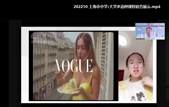 欣赏完大学生的校园生活片段,第二个主题是观看中学生们制作的视频作品。这些作品从全市92件参赛作品中脱颖而出,从多维的角度出发,用法语讲上海故事,介绍了上海的百年发展历程,探讨了上海市15分钟城市生活圈的建设,介绍自己居住环境的变迁,并展示了学生自身的才艺,如自弹自唱法语歌曲、法语配音、自编自导的小短片等,十八般武艺令人目不暇接。
