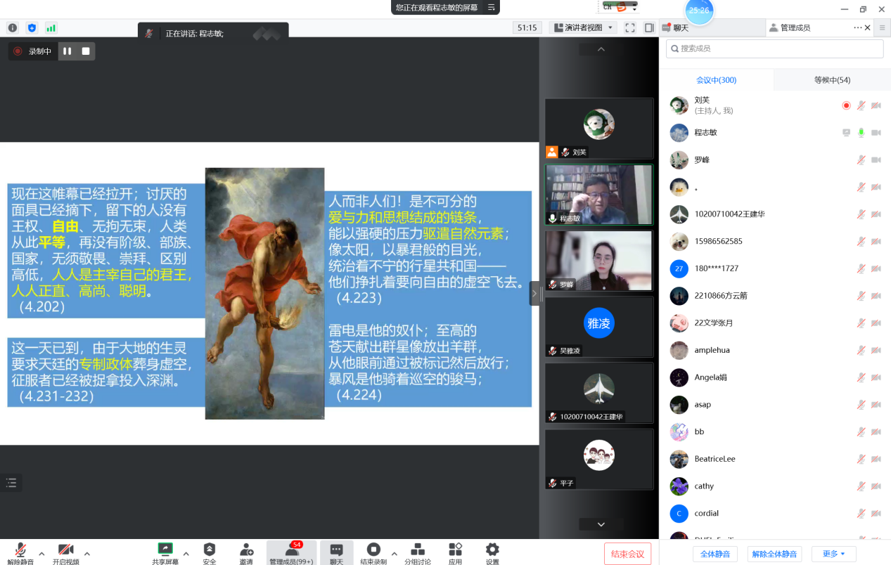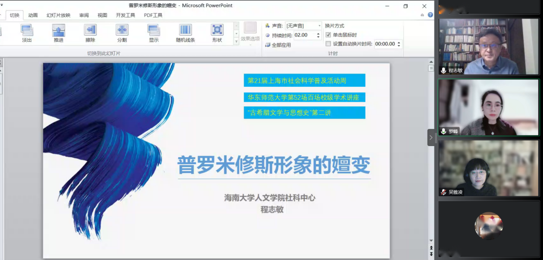 师生做了主题为“普罗米修斯形象的嬗变”的讲座。本次讲座入选第21届上海市社会科学普及活动周,系百场校级学术讲座第52讲。讲座由英语系罗峰副教授主持,逾300名校内外师生以腾讯会议的方式线上参与。