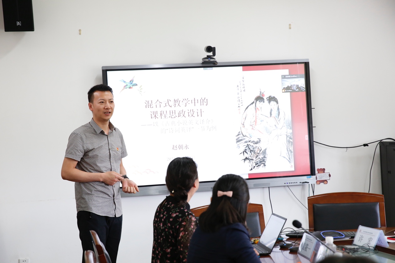 大学英语教学部赵朝永教授介绍了他所主讲的《古典小说英文译介》中课程思政的设计思路。他聚焦“诗词译介”,阐述了该课程对学生在价值塑造上的重要作用,展示了课程的主要内容、教学方法、目标达成的评价方式、课程资源、学习要求及考核方式。赵老师抓住古今中外诗歌均具有的“以诗言志”的特点,通过课前的经典诗歌赏析,鼓励学生比照现实中的自己,实现其世界观、人生观、价值观的塑造;通过课堂教学中汉语诗歌及其英译本的对比分析,从语言和文化两个维度思考诗歌的古今差异和中英差异,提升学生对民族语言的自豪感,培养学生家国情怀;通过探讨诗歌英译与传播的问题和出路,培养学生对中国文学、中国文化走出去的使命感和责任心。赵老师重点推介了今年五月由拷贝漫画