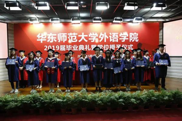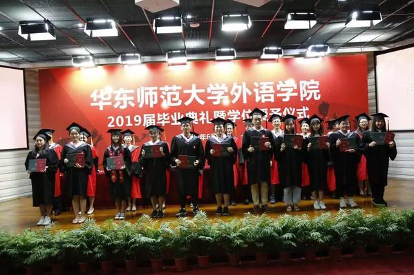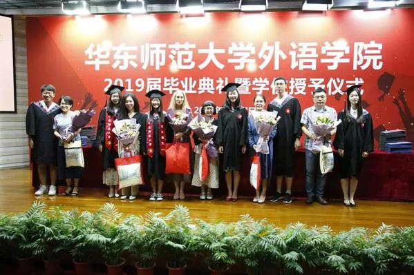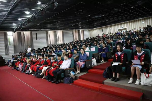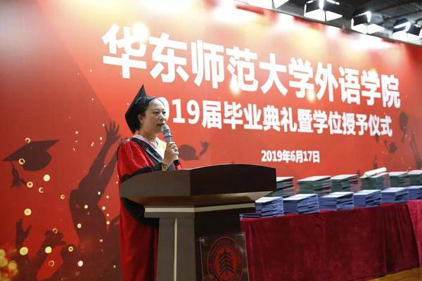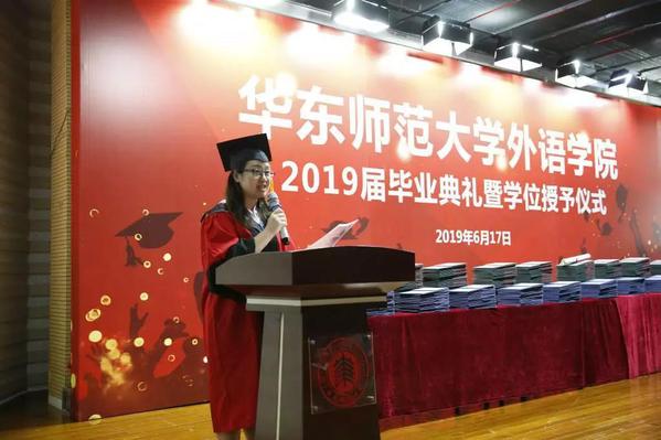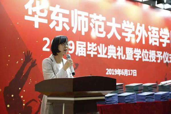院长袁筱一、党委书记闫露、副院长朱晓映、侯敏跃老师、杨延宁、党委副书记兼副院长江宇靖、英语系和翻译系系主任陈弘、法语系系主任王静、德语系系主任宋健飞、俄语系系主任刘玉琴、日语系系主任尹松老师、翻译专业责任教授窦卫霖、西班牙语专业教研室主任徐泉、各系的专业老师代表、辅导员、院办的行政教师、院学生联合会的同学、家长们齐聚现场,参加2019 届毕业典礼暨学位授予仪式。仪式由院党委副书记兼副院长江宇靖主持,在庄严的国歌后,江宇靖回顾了2019届毕业生取得的辉煌成绩,宣布 2019 届毕业典礼暨学位授予仪式正式开始。