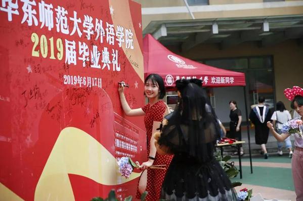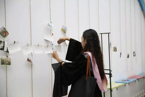 也为 2019 届毕业生搭建了一个大舞台。舞台旁边,毕业生们在明信片上写上毕业寄语,每一张明信片上都是最纯真的感言、最美好的回忆,都是对母校、对老师、对同学的不舍和祝福。同学们把明信片挂在典礼会场门口的“回忆长廊”上,长廊上还摆放着这届毕业生戏剧节的海报,毕业生们纷纷和海报合影,回忆起当年全班一起准备“莎士比亚”主题舞台剧的点点滴滴。