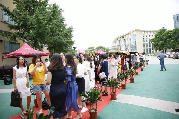 的辅导员和学生联合会的同学就来到大学生活动中心的空地上为毕业典礼做准备。大家在空地上铺开了红地毯,在两旁摆放了点缀的绿色植物。工作人员也为毕业生们准备了走红毯时需要的道具,包括配合毕业主题的一捧捧绣球花。这场精心准备设计的“毕业红毯秀”也是希望让毕业生在即将离开华师大之际,留下一份美好的回忆。