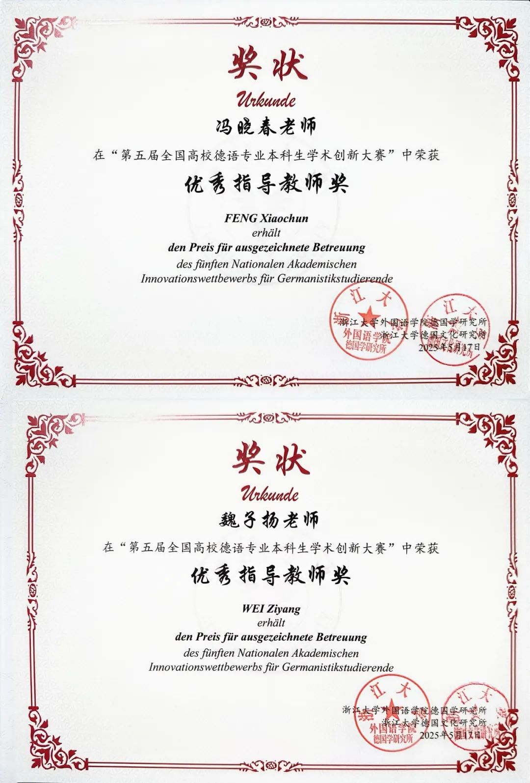 德语系始终将本科生学术创新能力培养作为教学核心目标,通过个性化学术引导、创新项目孵化及学科竞赛支持,系统提升学生的专业素养与研究能力,从而推动专业教学的高质量发展。期待德语系师生在未来的赛事中继续同心协力,勇攀高峰,再创佳绩!