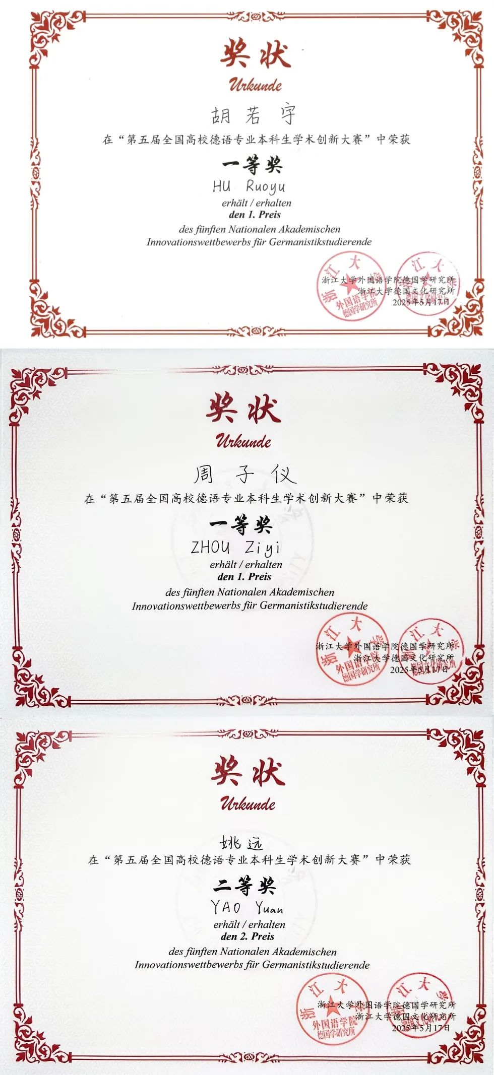 2025年5月17日,第五届全国高校德语专业本科生学术创新大赛决赛暨本科生学术论坛在浙江大学紫金港校区成功举行。本届大赛中,德语系2021级本科生胡若宇获文学赛道一等奖,2021级本科生周子仪获跨文化与区域国别赛道一等奖,2022级本科生姚远获文学赛道二等奖。德语系冯晓春副教授、魏子扬博士获优秀指导教师奖。自2021年首届赛事启动以来,拷贝漫画