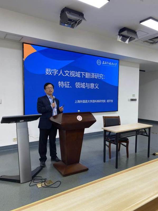 随后,胡开宝老师结合自己的课题项目,介绍了数字人文视域下翻译研究的属性与特征、主要领域(翻译文本研究、译者研究、翻译史研究与翻译教学研究)以及数字人文视域下翻译研究的意义。