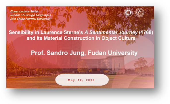 讲座从劳伦斯·斯特恩的自传体小说《感伤之旅》(1768)的阅读和接受的历程展开,重点关注情感(sensibility)在其中的表现。Jung教授从小说创作的背景出发,聚焦小说中的插图,考察了Maria这一人物在扇子(fan)、丝绸制品(silkwork)以及陶瓷(marriage jug)等不同物件文化中的再现,着重探讨了作品在物件文化中的创造和流传,及其后者反过来促进了读者对斯特恩小说作品的理解。