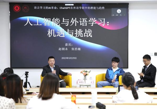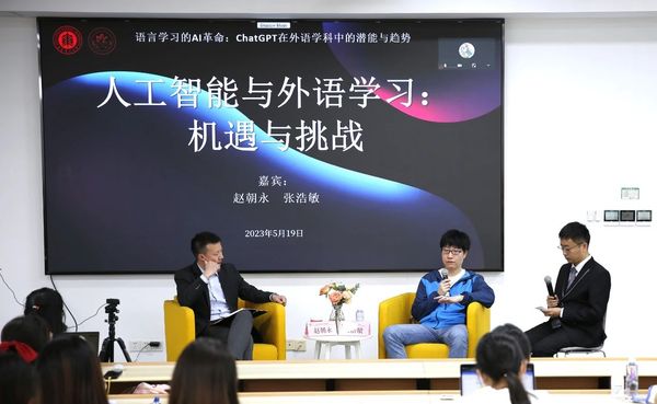 副院长赵朝永教授和张浩敏教授,与我们共同探讨人工智能时代,外语人如何认识人工智能的优势与不足,并发掘人工智能工具在外语学习与应用中的潜力。思勉人文高等研究院的李宪博博士特邀主持。