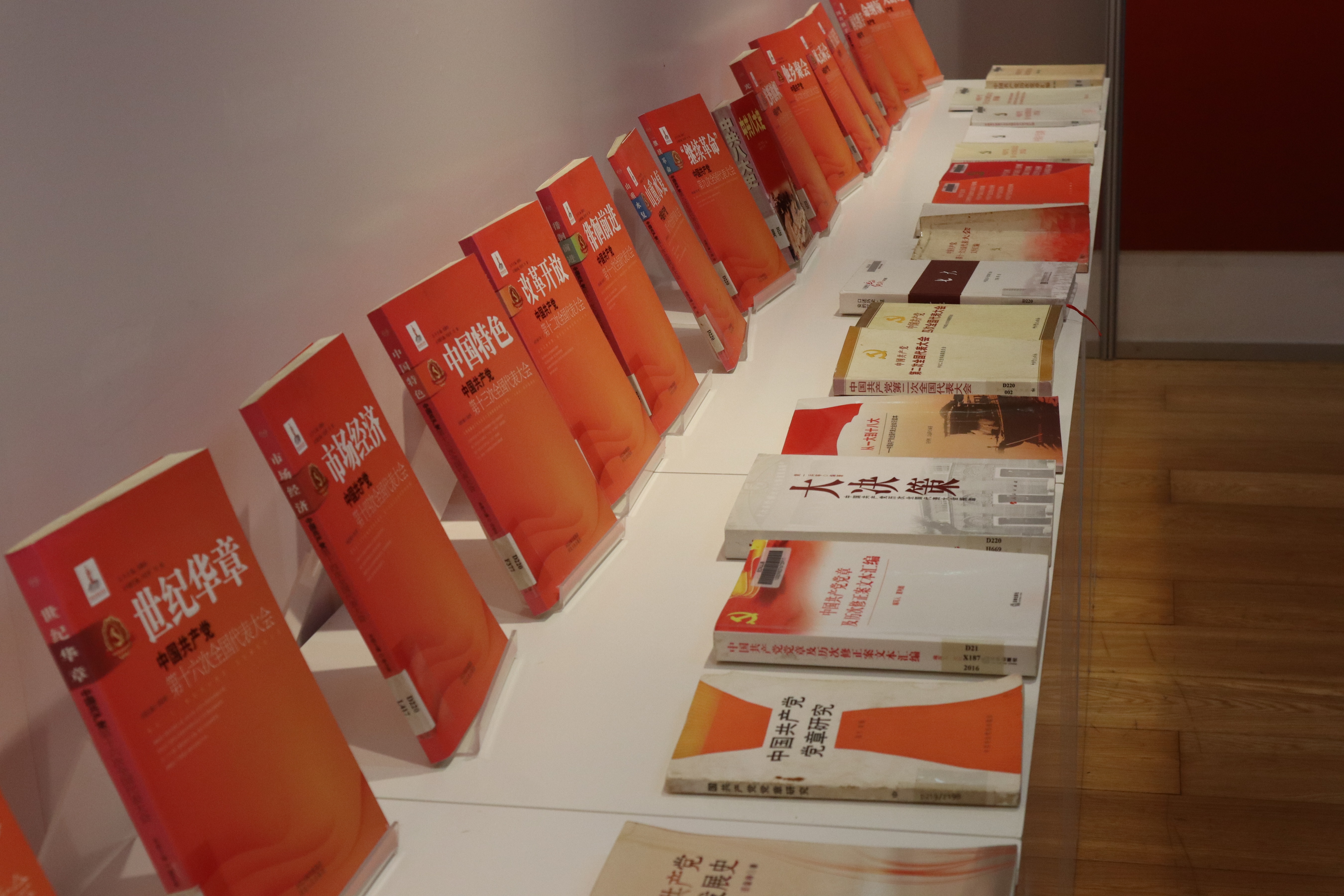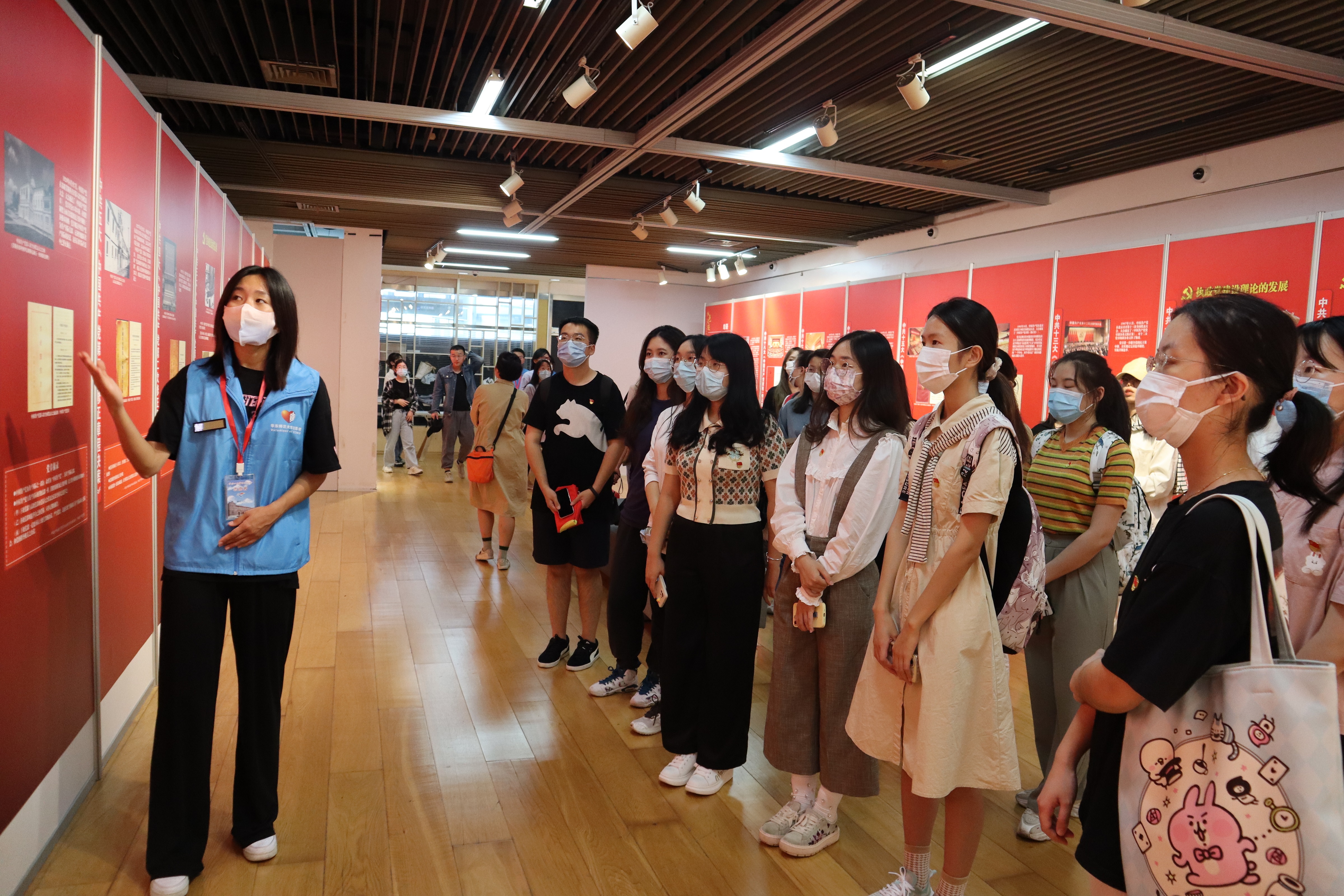 在志愿者讲解员的带领下,同学们进入展厅,首先映入眼帘的是一面鲜红的党旗,金黄色的镰刀锤头图案在鲜红背景的映衬下熠熠生辉。随后,讲解员细致地讲解了从中共一大《中国共产党纲领》的通过,到中国二大第一部正式党章的诞生,一直到中共十九大党章修正案的通过这背后百年的历史纤细和艰难历程。同学们聚精会神地聆听志愿者的讲解,仔细查看展板上展出的珍贵历史图片,阅读其中的党章摘录,沉浸在党章从诞生到发展完善的历史岁月中。展厅中陈列的历史文献也引起了同学们的极大兴趣,一些同学认真地翻看,试图更深入地了解党章背后的历史。