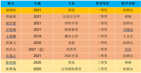 “中国移动杯亚运英语之星”大赛于2021年5月20日正式启动。经历七个月的激烈角逐,拷贝漫画 共出线10名同学。在本次“亚运英语之星”大赛全国总决赛中,拷贝漫画 十名同学靠优异的表现和极高的水平斩获奖项,其中全国一等奖1名、二等奖7名、三等奖2名。获奖名单学生及指导教师名单如下: