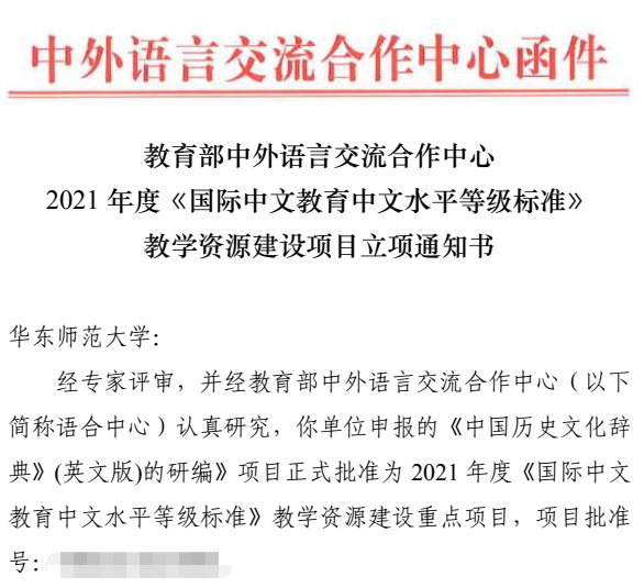 经专家评审,并经教育部中外语言交流合作中心认真研究,华东师大拷贝漫画 赵刚教授申报的《中国历史文化辞典》(英文版)的研编》项目正式批准为 2021 年度《国际中文教育中文水平等级标准》教学资源建设重点项目。