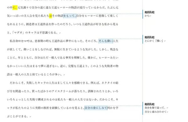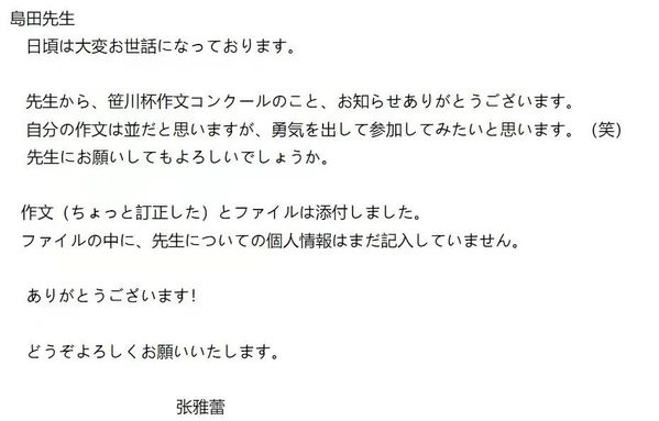 选题决定后,我完成了初稿,发给岛田老师。岛田老师不仅肯定了我的内容,还为我细致地修改了语法错误,提出了修改意见。