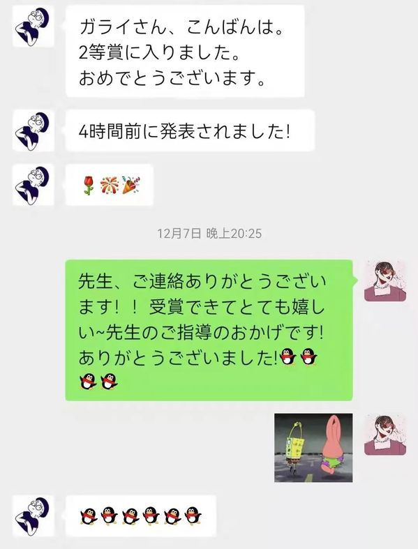 岛田老师来信通知我获奖时,非常惊喜。十分感谢自己的作品能够得到大家的认同。回顾整个参赛过程,我想岛田老师耐心细致的指导、真诚的鼓励是我参赛的最大动力和支持。尽管岛田老师已经荣休,但我很想把这个荣誉作为礼物送给岛田老师,表达我真诚的感谢和祝福。