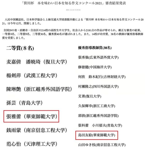 本届大赛“笹川杯品书知日本征文大奖赛2021”由人民中国杂志社、日本科学协会、上海交通大学图书馆共同主办。据悉组委会共收到来自全国214所高校、高中和社会的投稿2181篇,经过专家评委严格的筛选和审查,最终评选出一等奖4名、二等奖8名、三等奖30名以及优秀奖40名;最佳组织奖14名;优秀指导教师奖38名。
