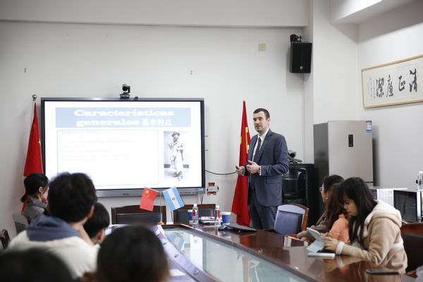 随后,康德名先生为西班牙语专业一至四年级学生开展《阿根廷的高乔人》文化讲座,生动而详细地介绍高乔民族的历史由来、高乔文化的丰富表现、高乔文学代表作家及作品,阐释高乔人对阿根廷民族性格及意识形成的影响。