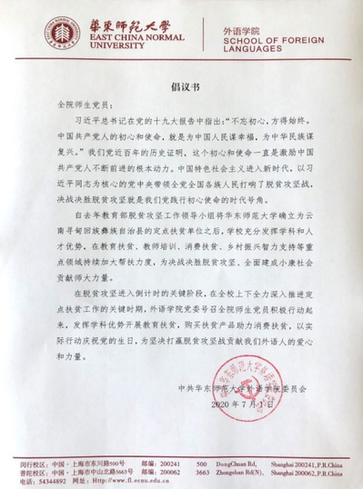 在脱贫攻坚进入倒计时的关键阶段,在全校上下全力深入推进定点扶贫工作的关键时期,拷贝漫画 党委积极响应上级号召,于2020年7月1日,开展“助力脱贫攻坚,庆祝建党九十九周年”主题党日活动,号召全院师生党员以实际行动庆祝党的生日,为坚决打赢脱贫攻坚战贡献外语人的爱心和力量。本次活动由学院党委副书记兼副院长江宇靖主持,全院线上线下师生党员120余人参加。